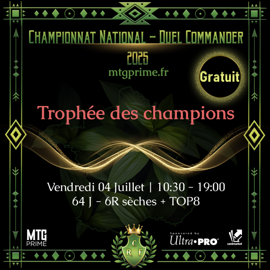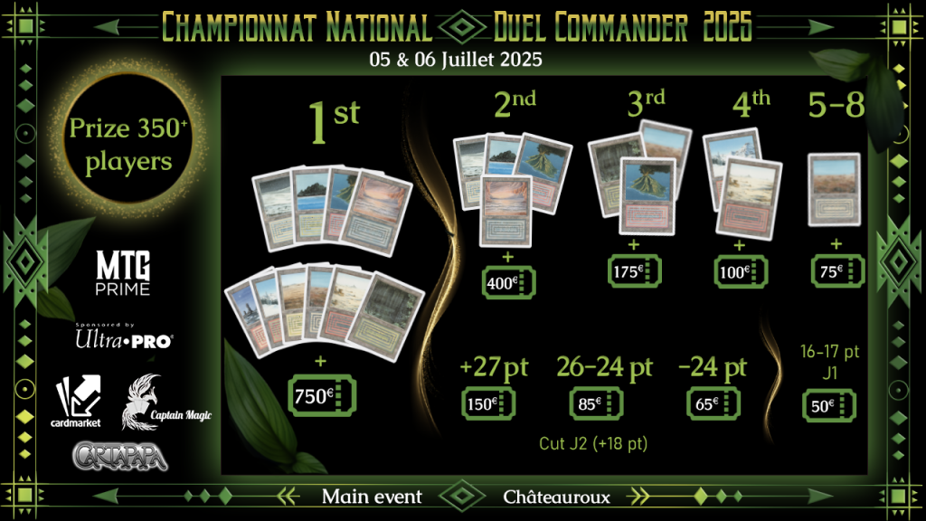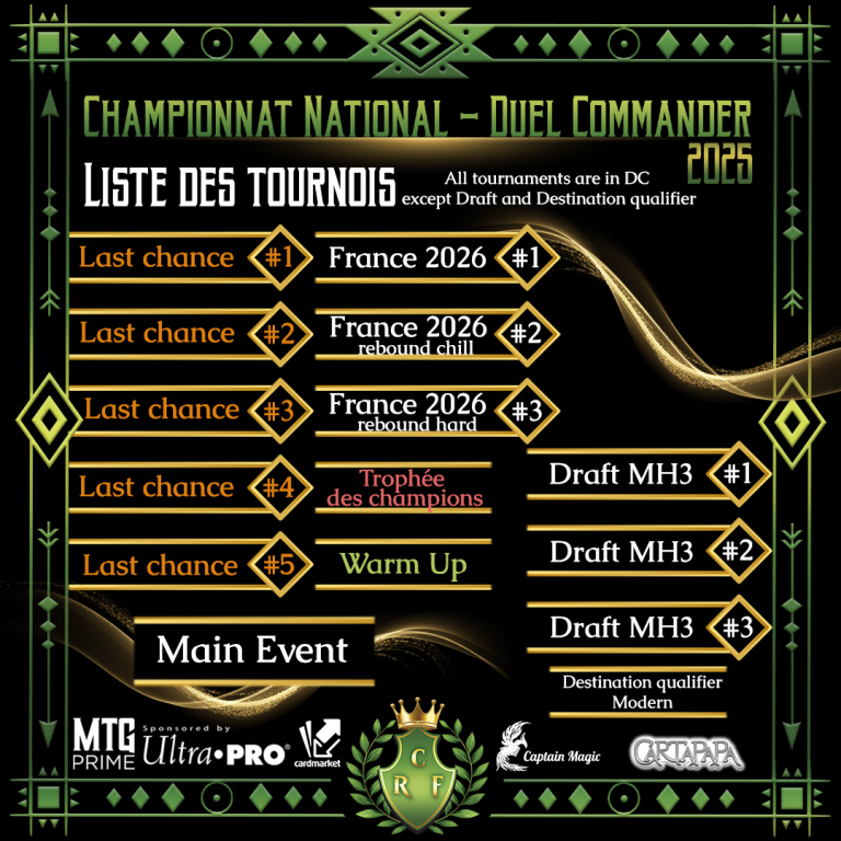 L’élite du Duel Commander de toute une saison réunie dans un même tournoi ! Vous en rêviez ? Nous l’avons fait ! Chaque Champion Régional ainsi que chaque Challenger (vainqueur de tournoi DC 100+ affilié ou non au circuit durant l’année précédent le Championnat de France 2025) pourront s’affronter et se jauger durant tout une journée de duels intenses.